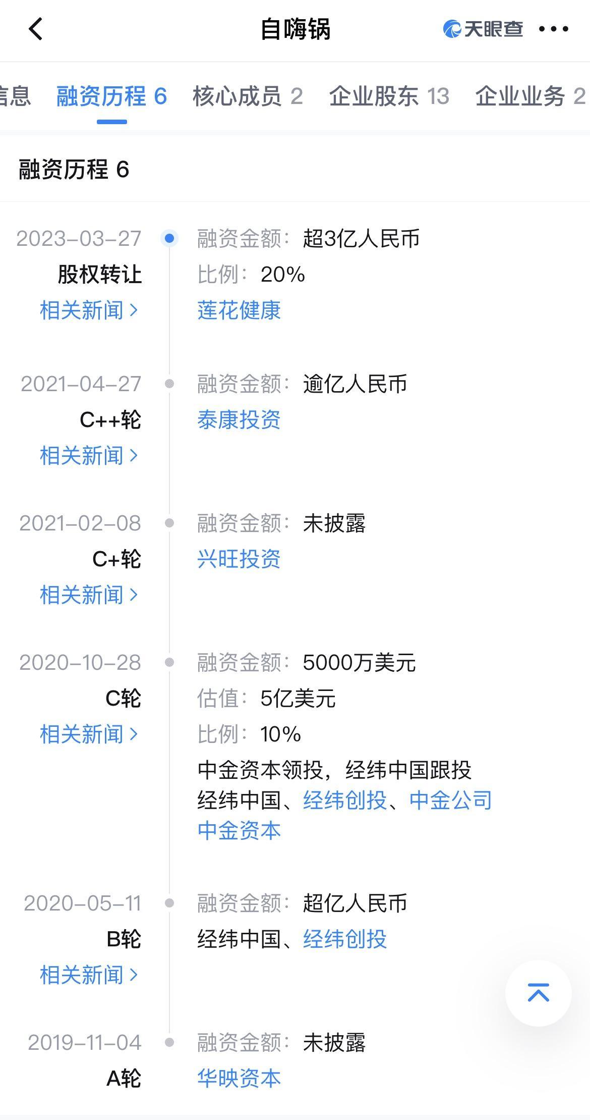 公开资料介绍,蔡红亮曾是百草味的创始人,2016年,好想你以9.6亿元的价格,收购了百草味母公司杭州郝姆斯食品有限公司100%股权。2018年,蔡红亮创办了杭州金羚羊,打造自嗨锅品牌正式“进军”自热火锅赛道。自嗨锅曾一度成为资本的“宠儿”,天眼查显示,2019年至2021年间,杭州金羚羊密集完成了五轮融资,华映资本、经纬创投及中金资本先后入局。